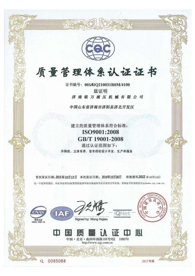 濟南銘萬液壓機械有限公司【原濟南機械廠】,是全國制造液壓升降機、升降平臺的廠家,產品有八大系列六十多個品種,規格齊全、質量穩定、安全可靠、方便快捷;產品銷往全國各地,深受用戶好評。升降機廠家技術力量雄厚,產品設計先進、工藝成熟、實驗檢測手段完善,“質量第一,用戶至上”是我們的宗旨。 本公司采用先進的管理手段,嚴密的質量監控體系和良好的售后服務隊伍為我們的產品走向市場創造......
